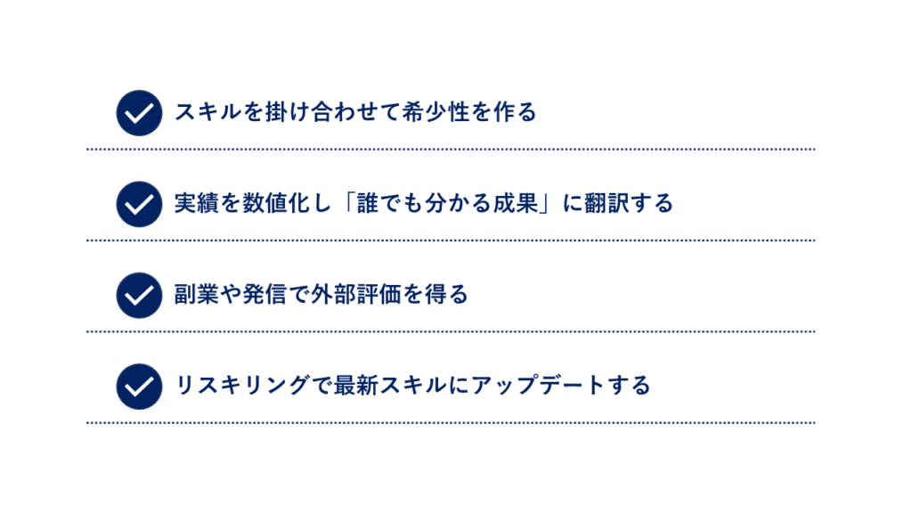 市場価値を守るためには、汎用性のあるスキルを意識して伸ばし、「どの会社でも再現できる成果」を積み上げることが重要です。