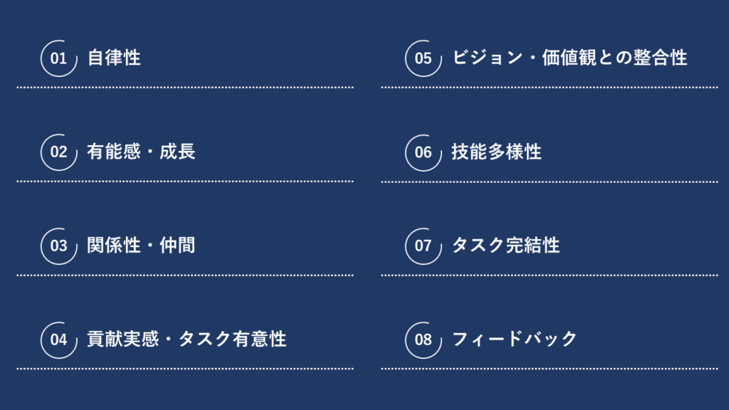 「自己決定理論」や「Job Characteristics Model」をベースに整理すると、仕事のやりがいは大きく8つの要素から構成されます。