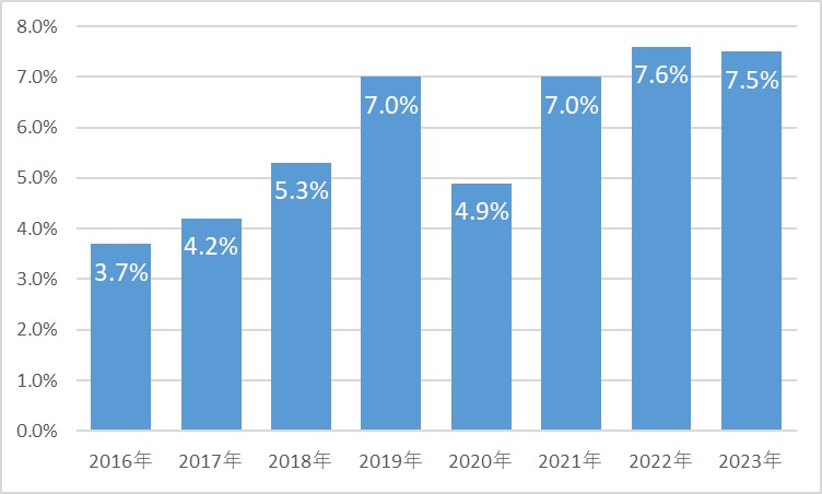 キャリアリサーチLabの転職動向調査によると、2023年の転職率は7.5%と、2016年のおよそ2倍の数値となっています。