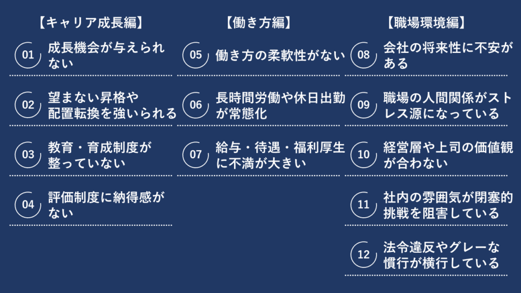 本記事では、会社に限界を感じる12のきっかけを「キャリア成長」「働き方」「職場環境」の3つの切り口に整理し解説していきます。
